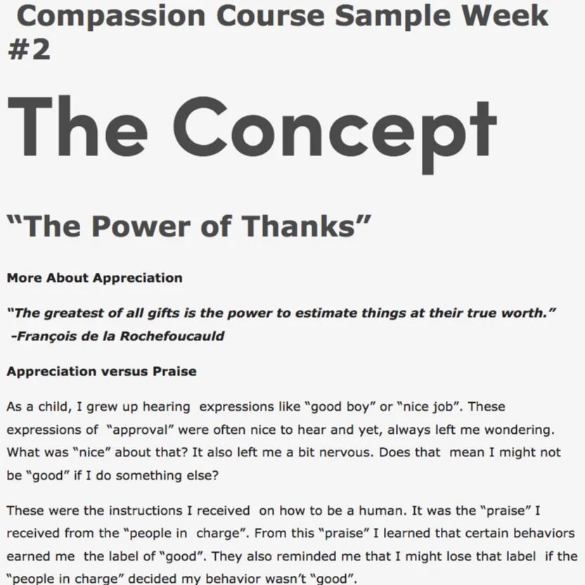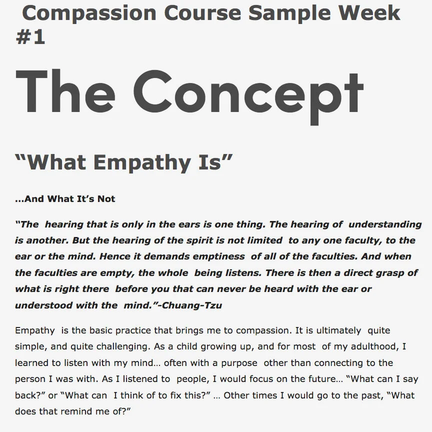 The course starts with foundational concepts and practices that help us understand what engenders compassion and what blocks it. As the year progresses, we work with more advanced practices and processes that help us bring more compassion into our everyday lives.